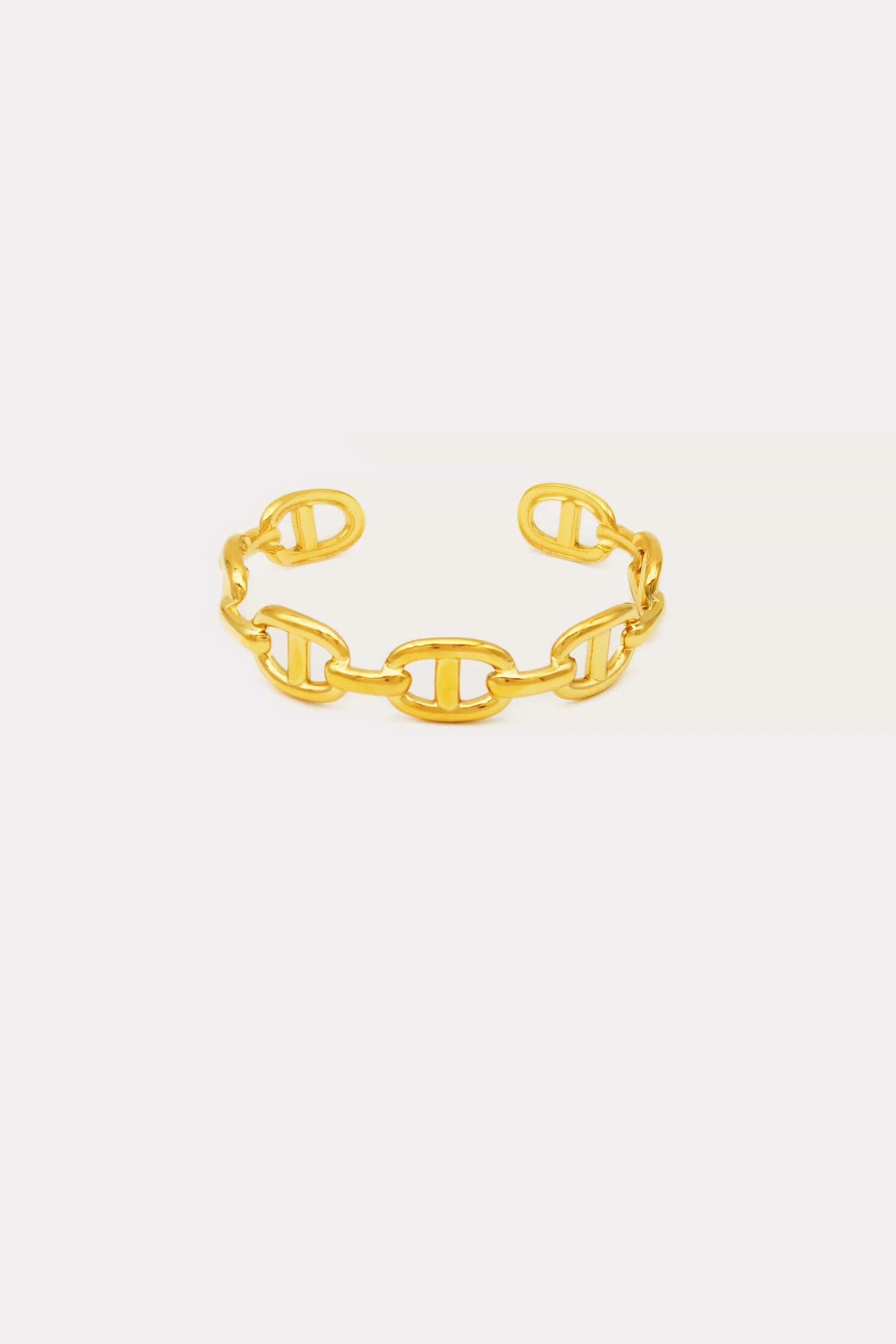 From Petit Moments, the Bit Cuff draws inspiration from classic equestrian design, featuring interlocking links that create a strong yet refined statement. Available in gold or silver finishes, this open cuff adds a touch of timeless sophistication to any look.