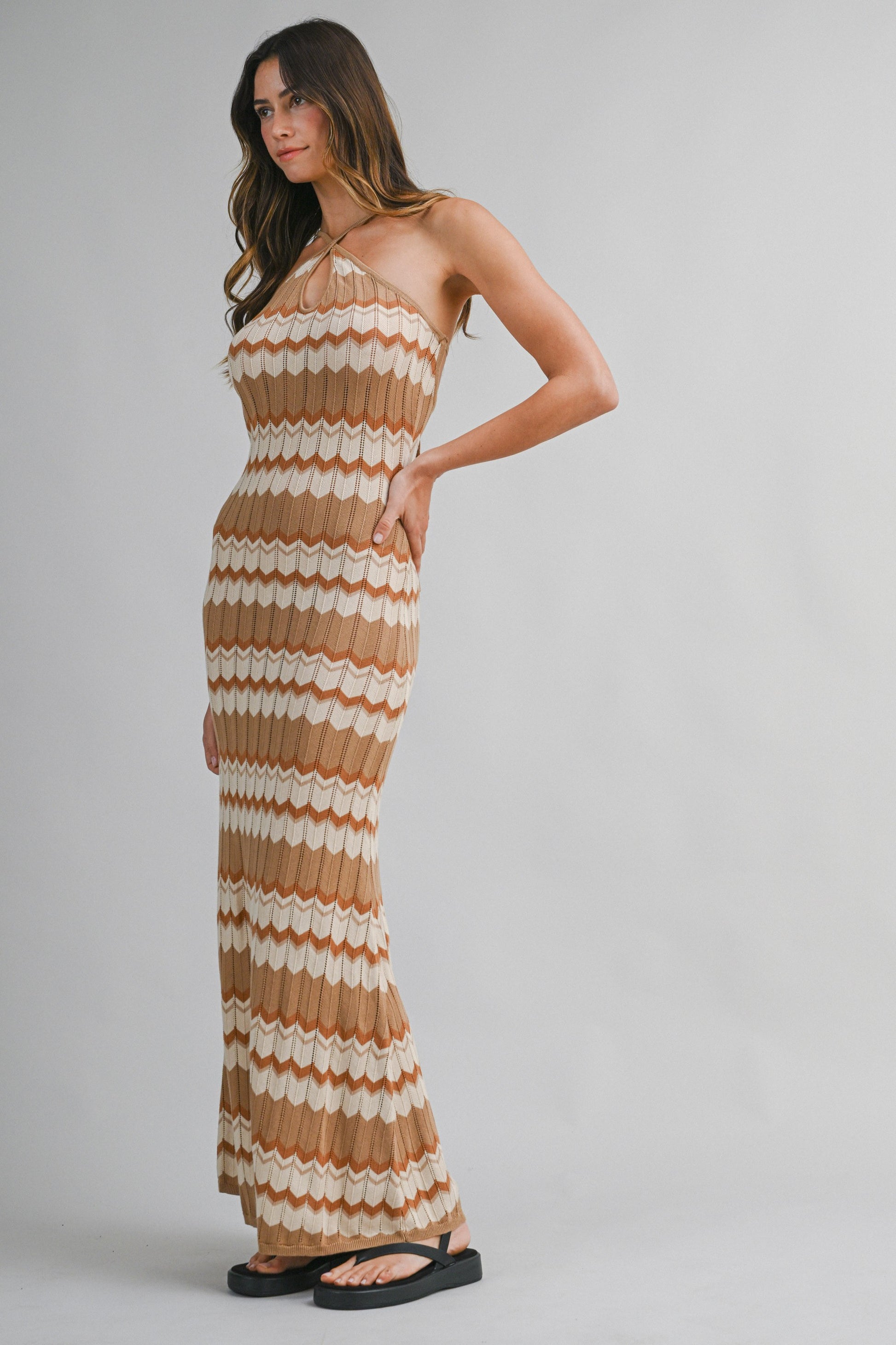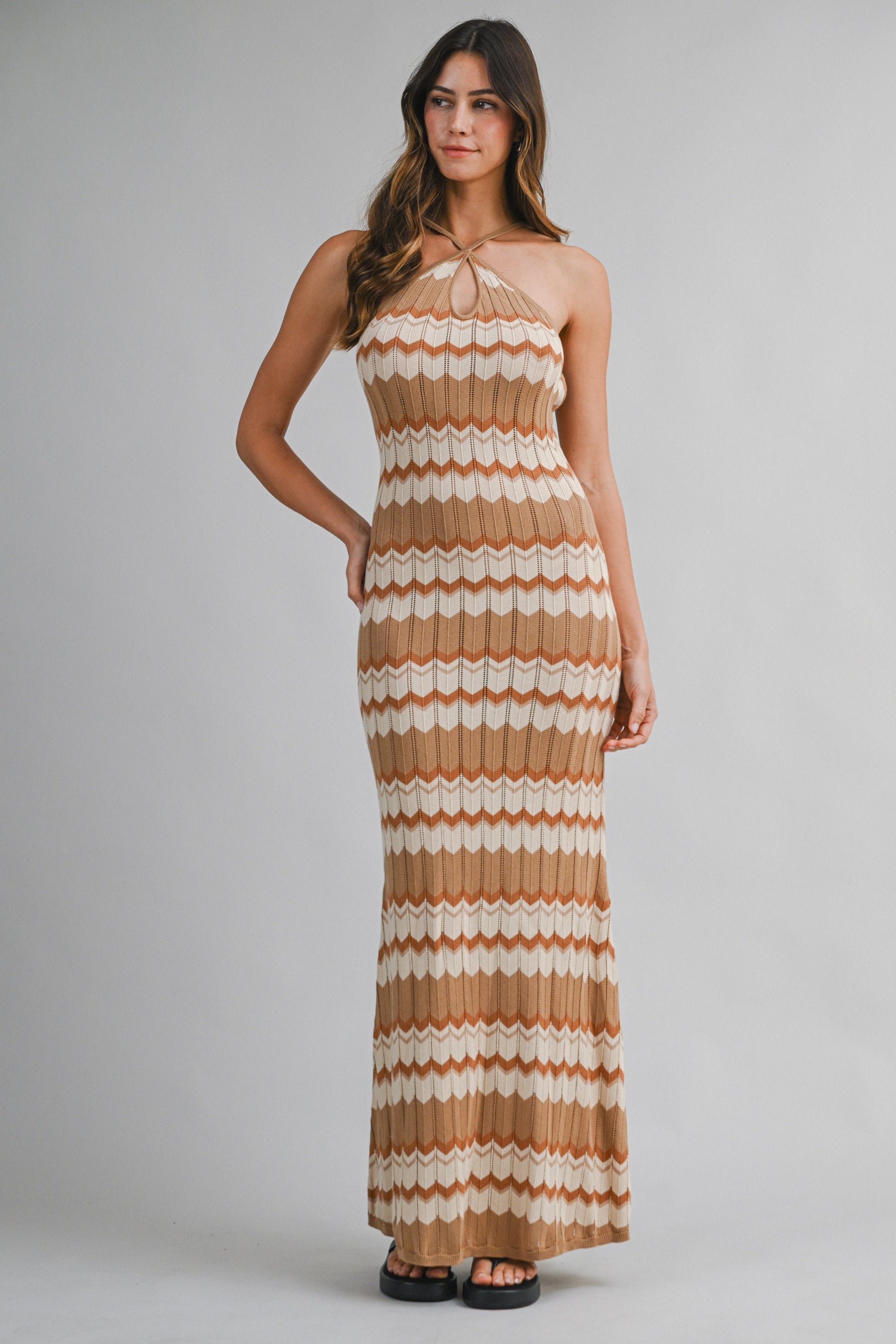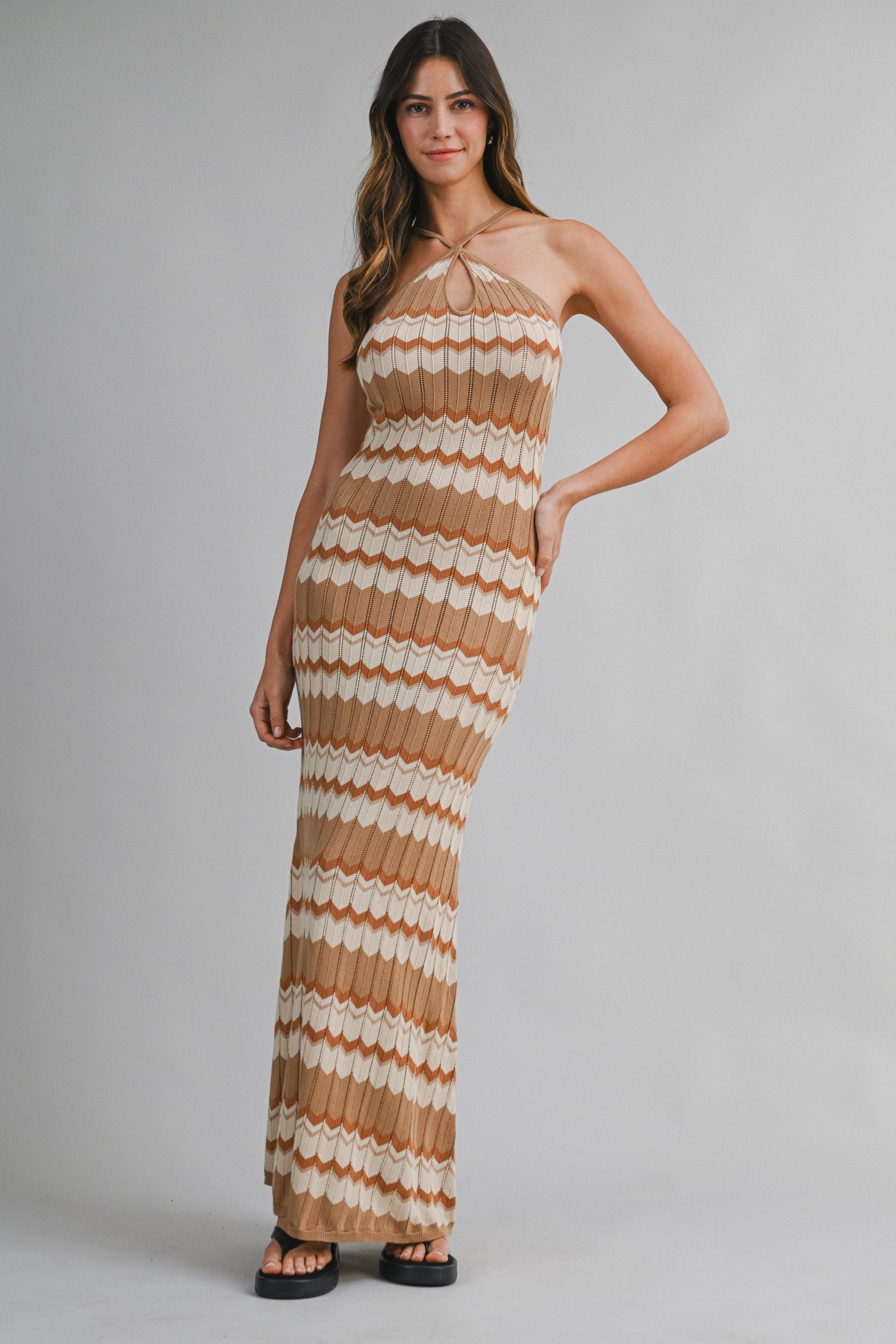 Bold, vibrant, and effortlessly flattering, the Catarina Maxi Dress turns the classic bodycon silhouette into a statement piece. Crafted in a soft knit with a geometric chevron pattern, this halter-neck midi dress features a cross-halter neckline with a small front keyhole cutout for a subtle touch of intrigue.