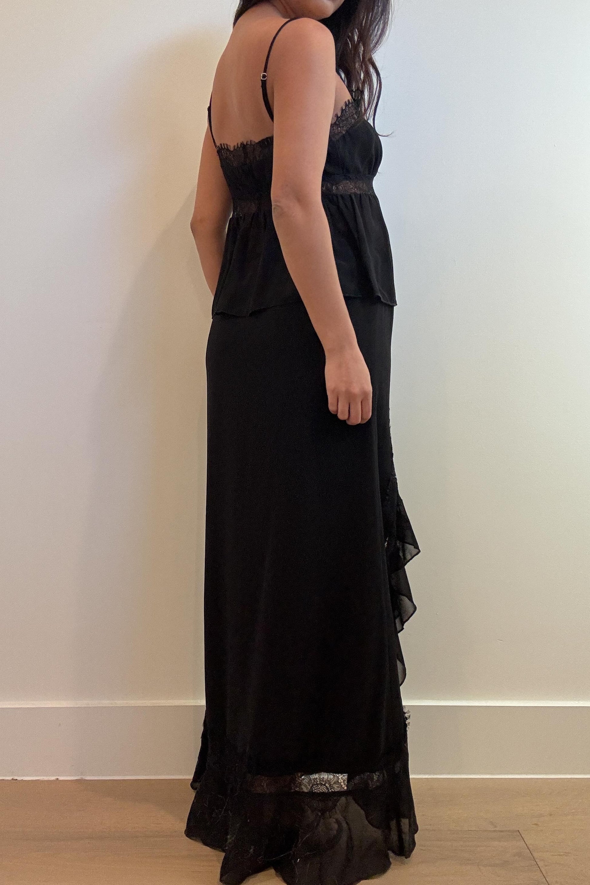Designed to highlight your silhouette, the delicate lace trim brings romantic texture while the front tie detail creates a flattering, adjustable shape. The coordinating side-slit maxi skirt elongates the body and allows for effortless movement, making this set equally suited for evening events, date nights, or elevated everyday styling.