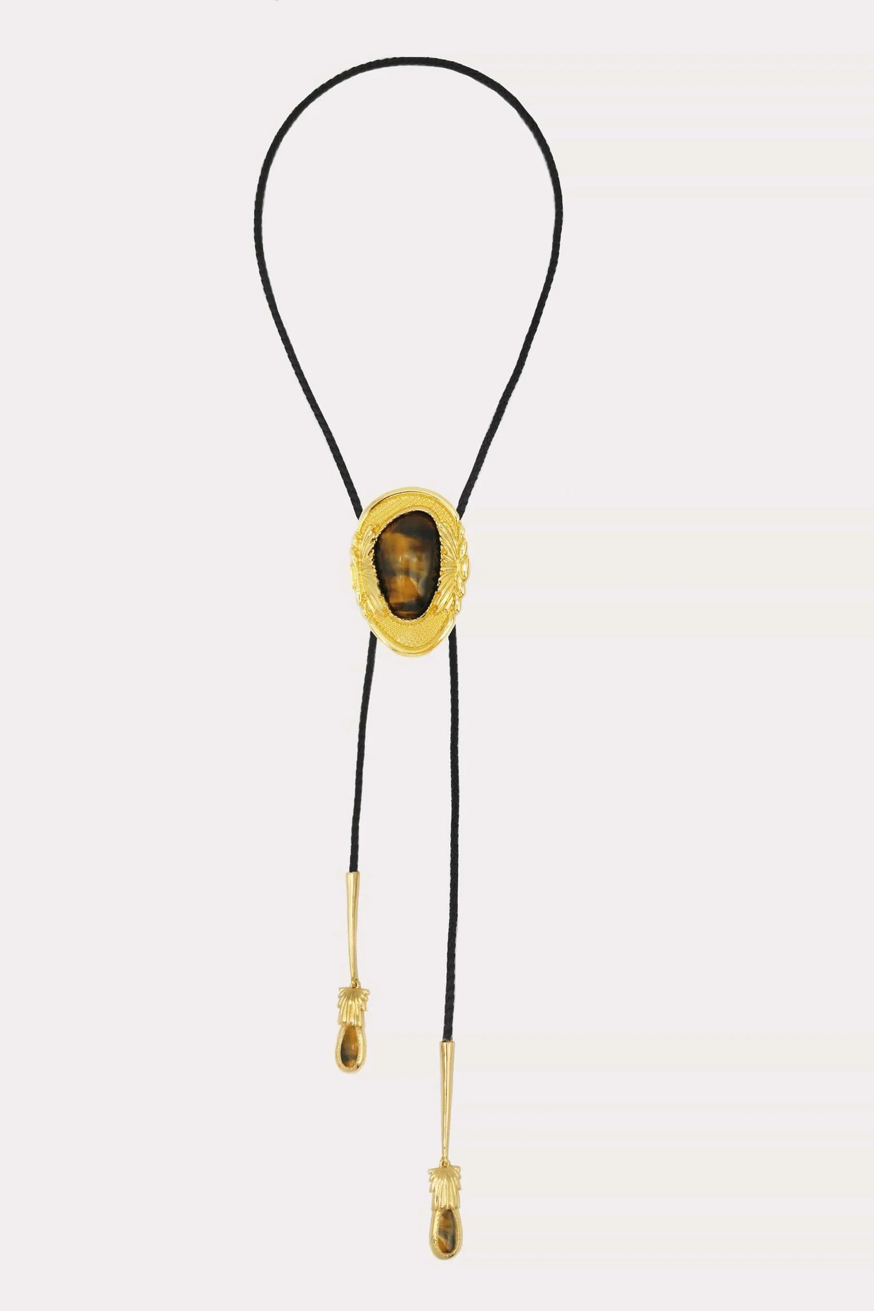 A modern take on a Western classic, this bolo tie necklace blends vintage charm with contemporary elegance. Featuring an intricately designed metal pendant and adjustable rope detailing, it's the perfect statement piece to add a bold, Western-inspired touch to any outfit. Adjustable.
