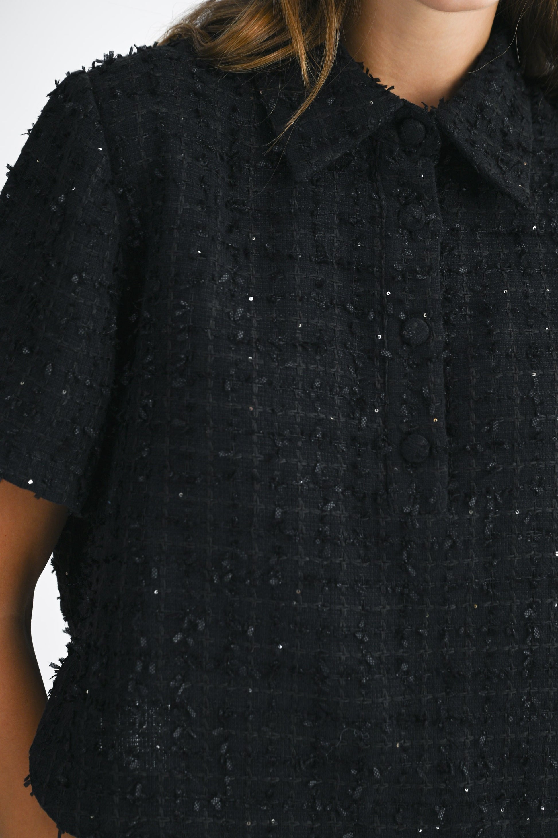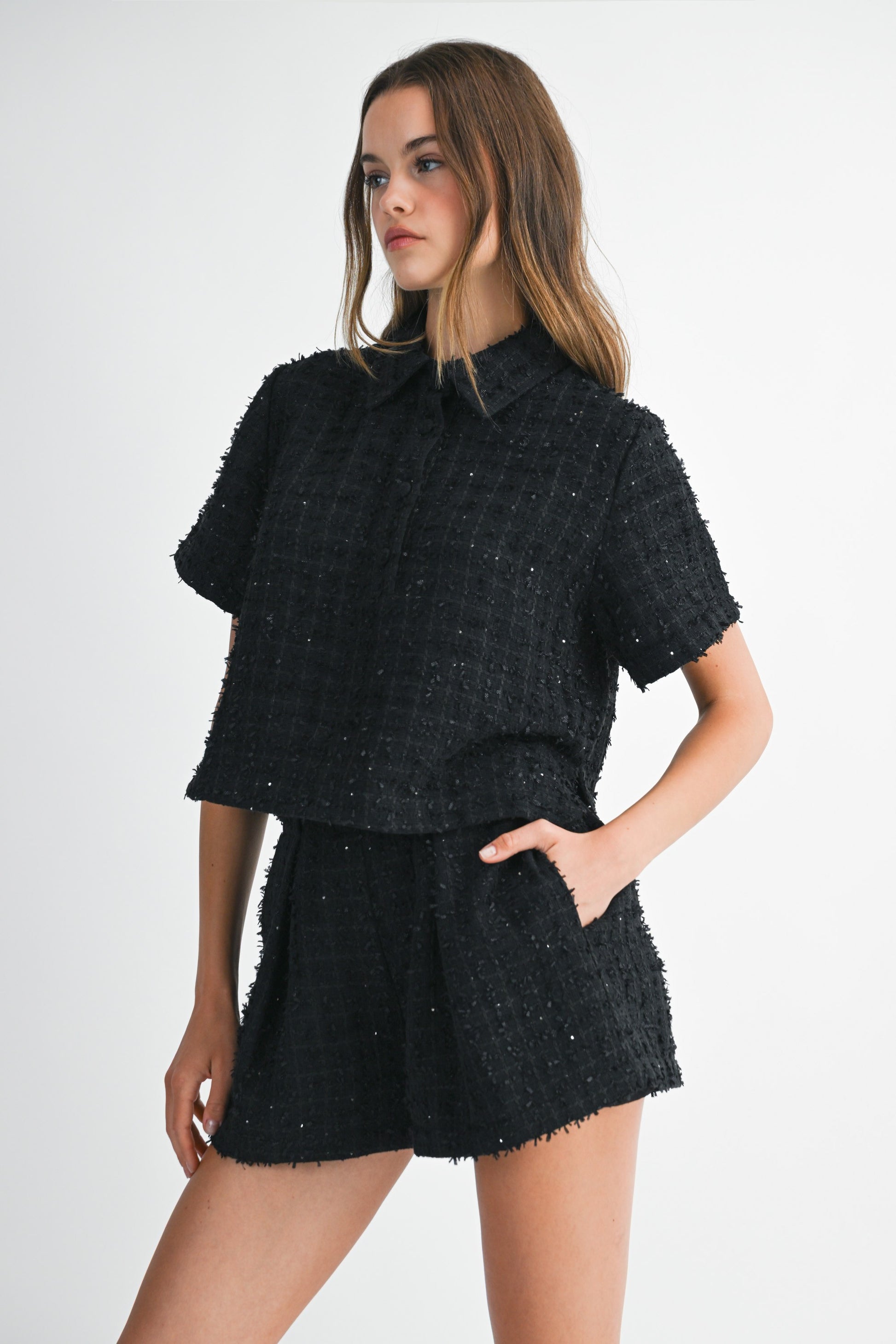 Chic meets playful in the Haute in the Hills Set. Crafted from shimmering lurex tweed, this black two-piece look features a collared, short-sleeve top with a half button-down front for a touch of classic polish. The matching pleated-front shorts are fully lined for comfort, designed with an invisible side zipper and functional pockets for a seamless, flattering fit. Perfect for day-to-night dressing, this set brings elevated ease to any outing.