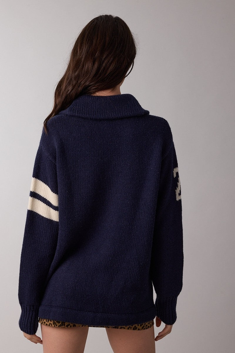 Elevate your everyday style with the Heritage Varsity Cardigan, a modern take on classic collegiate charm. Designed in a rich deep blue graphic print, this cardigan combines sporty inspiration with timeless comfort. The collared necklineand front button-down closure add a refined, structured touch, while the long sleeves and cozy knit finish keep it effortlessly wearable.