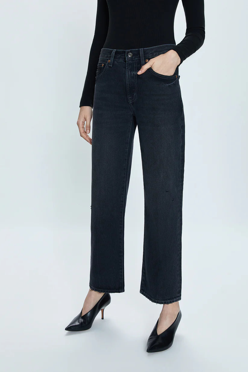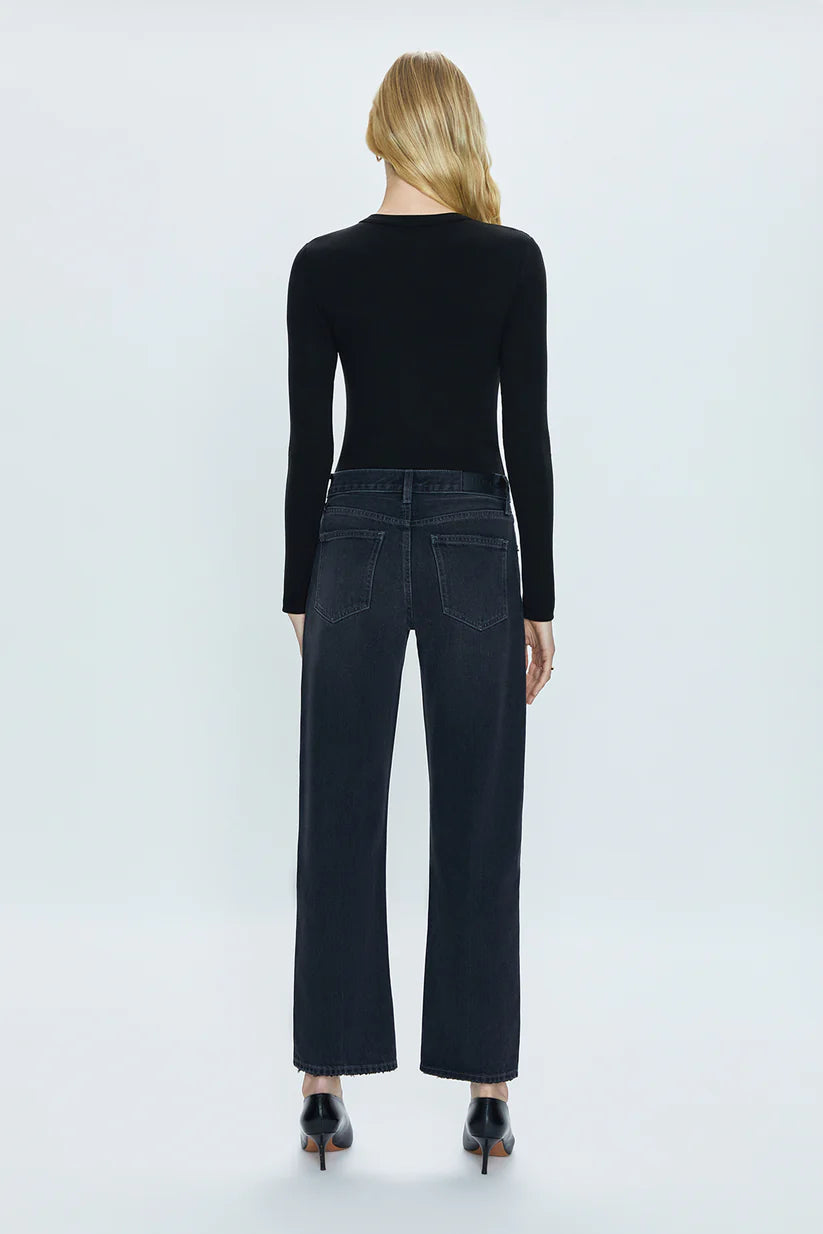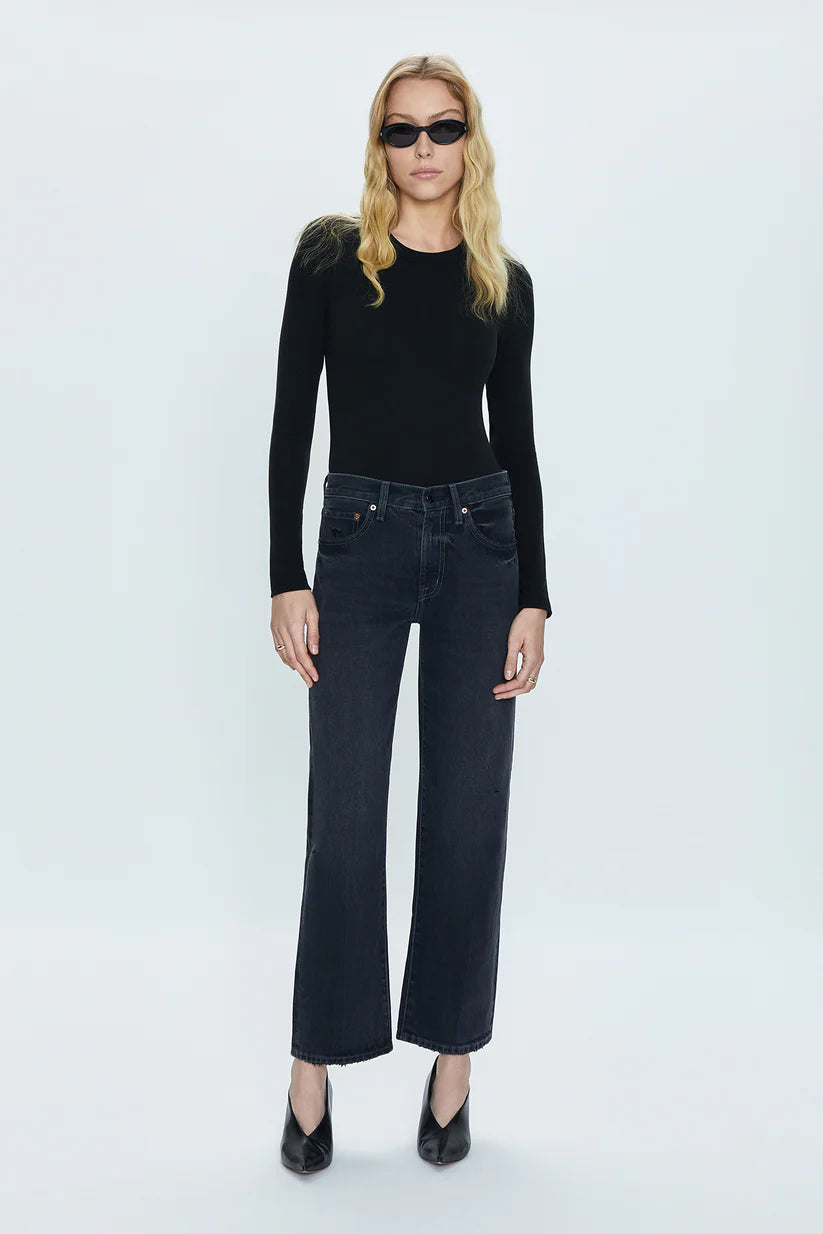 The best-selling jean that understands proportions. Lexi sits at the perfect mid-rise with our signature bowed straight leg, a subtle curve at the knee that creates dimension without effort. Finished with a 29" inseam, the sculpted silhouette tapers to a cropped ankle with a clean hem. Crafted from our rigid denim in Mercury, a dark wash.
