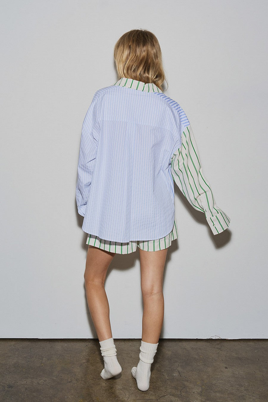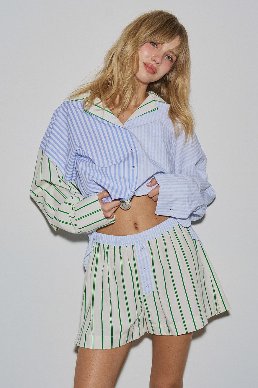 A fresh take on effortless dressing, the Mixed Media Set blends classic stripes with an unexpected contrast for a cool, modern feel. Designed in breathable cotton with a soft mixed-fabric accent, this set features a relaxed button-down top paired with matching pull-on shorts for an easy, throw-on-and-go look. Wear it styled together for maximum impact or mix and match each piece with your everyday staples.