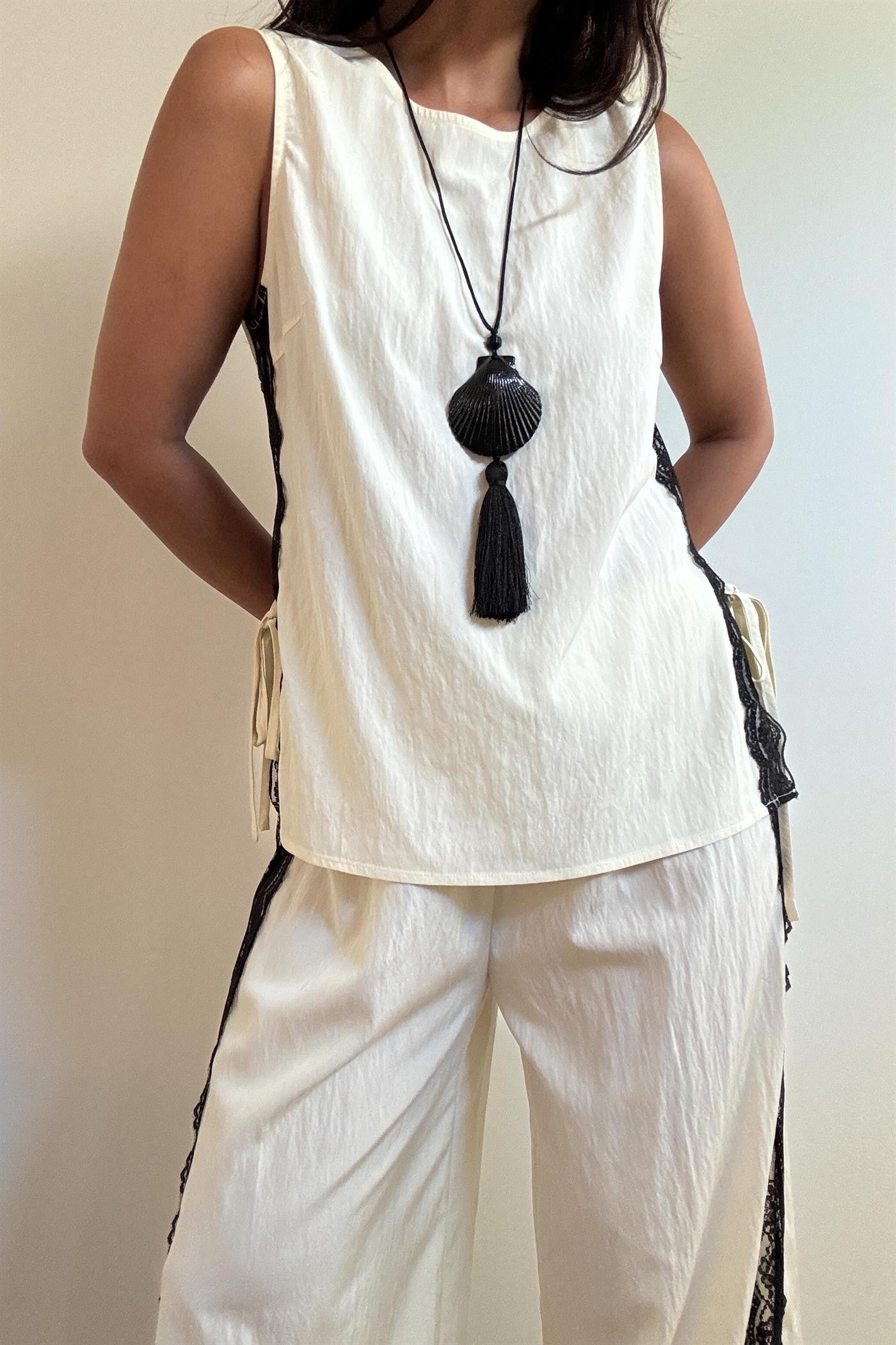 Designed with a sleeveless top and coordinating wide-leg pants, the silhouette is easy, flattering, and endlessly versatile. The side lace detailing elongates the frame and brings a romantic edge to this modern matching set, making it perfect for everyday styling, resort wear, or elevated casual occasions.