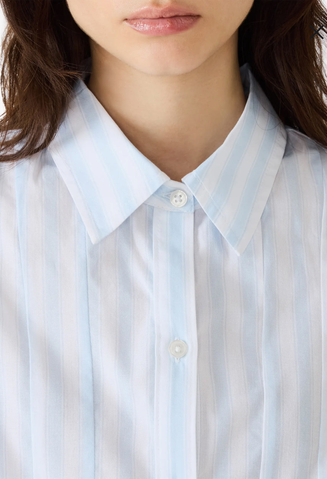 Cut from breezy cotton, this short-sleeve shirt is covered in soft stripes and finished with a flared peplum.