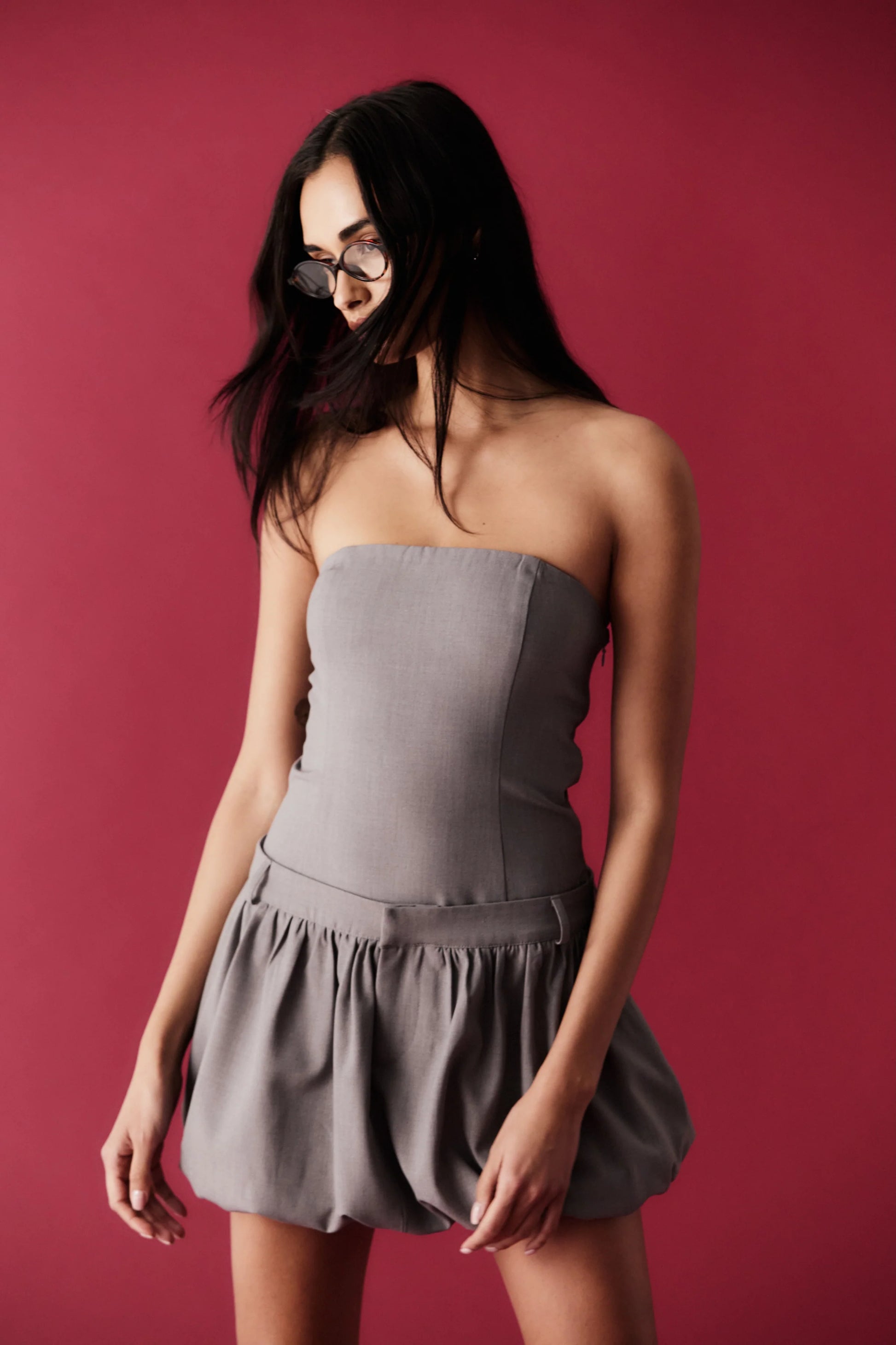 Sculpted shape with a playful finish. The Valentina features a fitted, paneled bodice and defined waistband that leads into a gathered peplum detail at the hips. The bubble hem skirt adds volume and dimension, balanced by clean lines up top. Designed with belt loops for styling versatility.