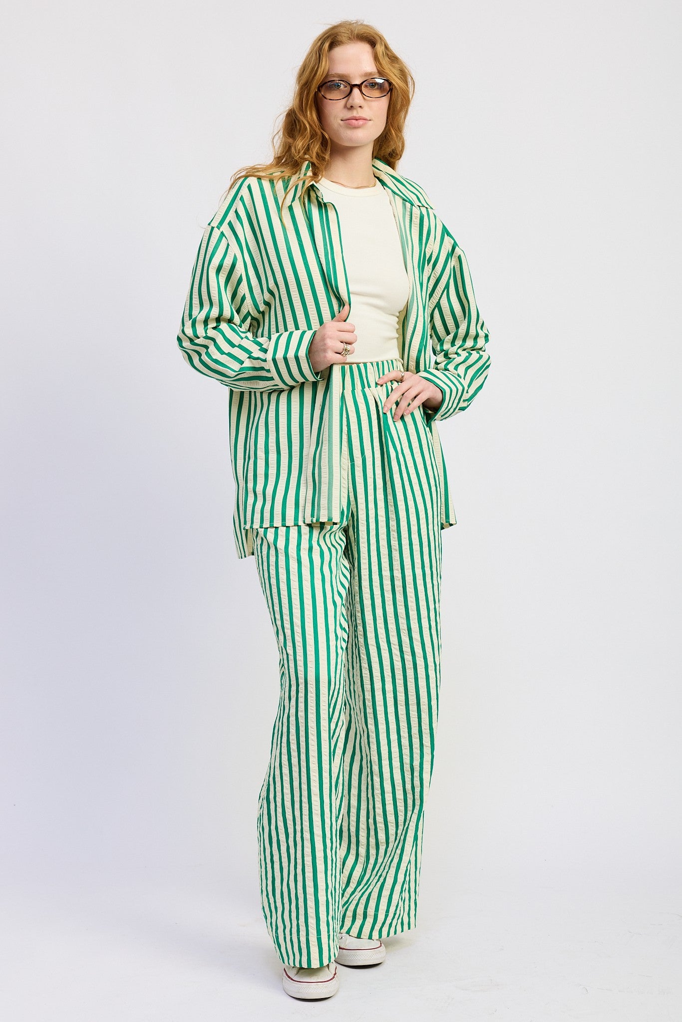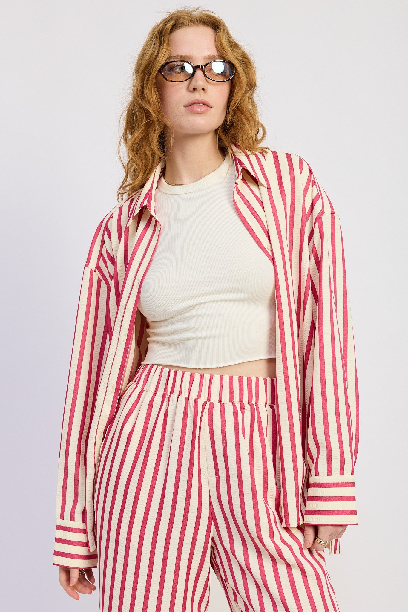 Step into effortless, playful style with the Zivra Oversized Stripe Shirt. Featuring bold stripes in vibrant red or green with contrasting white accents, this collared button-down brings a fresh, statement-making vibe to any outfit. Its oversized fit and breathable fabric make it perfect for layering over festival outfits, pairing with shorts, or styling with the matching Zivra pants for a coordinated set.